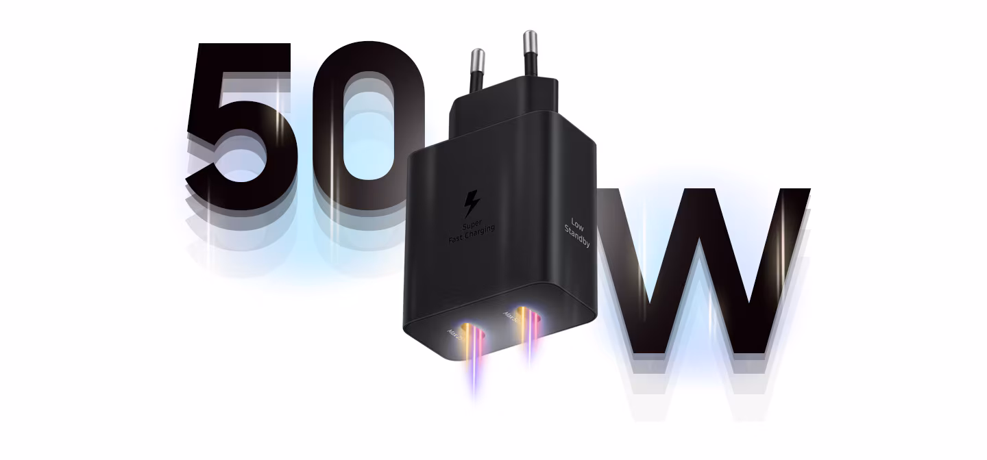 * Super Fast Charging (SFC) 2.0 requires a USB Power Delivery (PD) 3.0 compatible device supporting Direct Charging. Devices lacking USB PD 3.0 standard or Direct Charging will charge slower than SFC speed. Charging speed varies based on usage patterns, conditions, connected devices, and other factors. Charging performance may be affected by device model, cable quality, and environment. To optimize results, use genuine Samsung 5A cables provided in the original packaging. Compatibility with additional devices can expand over time.